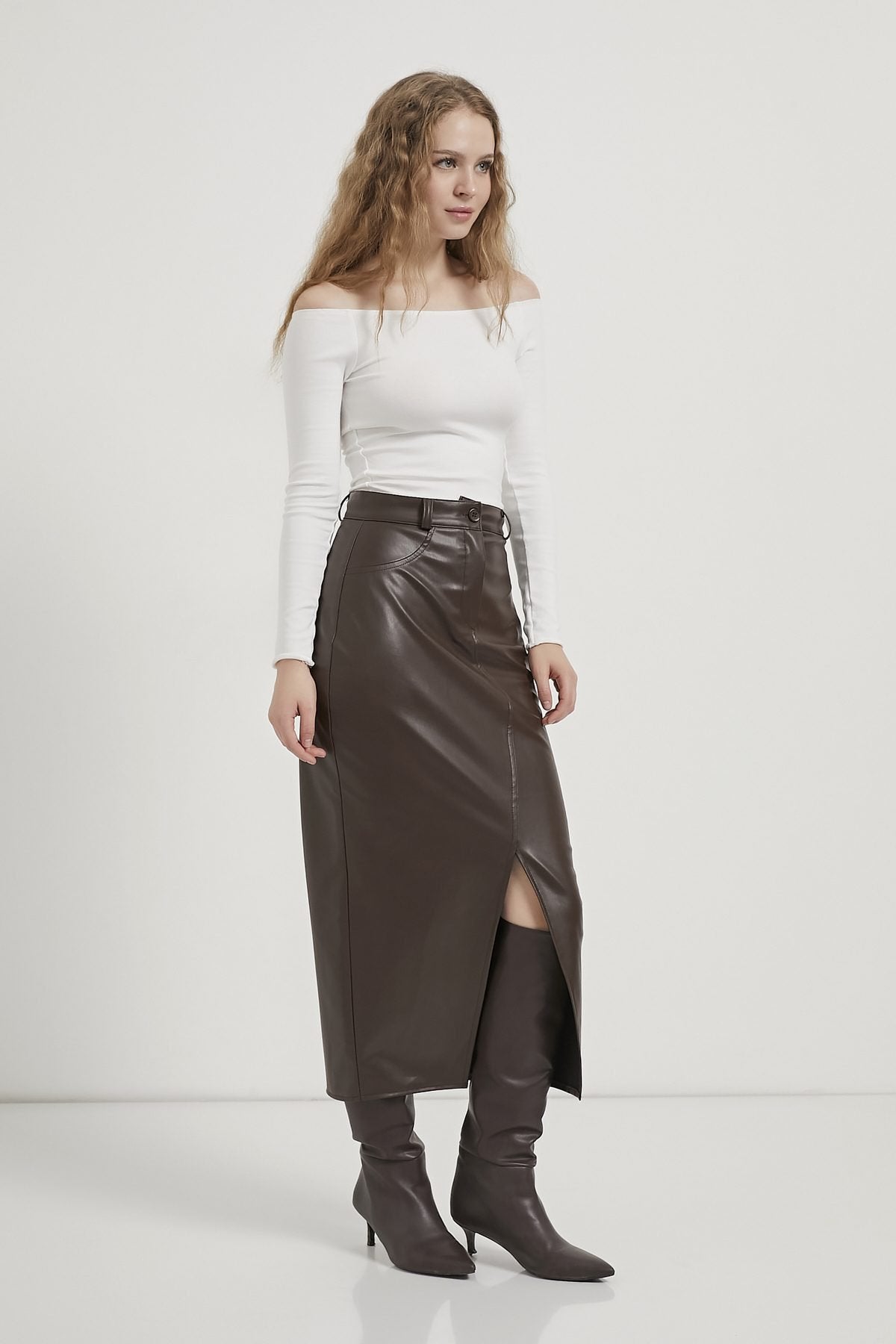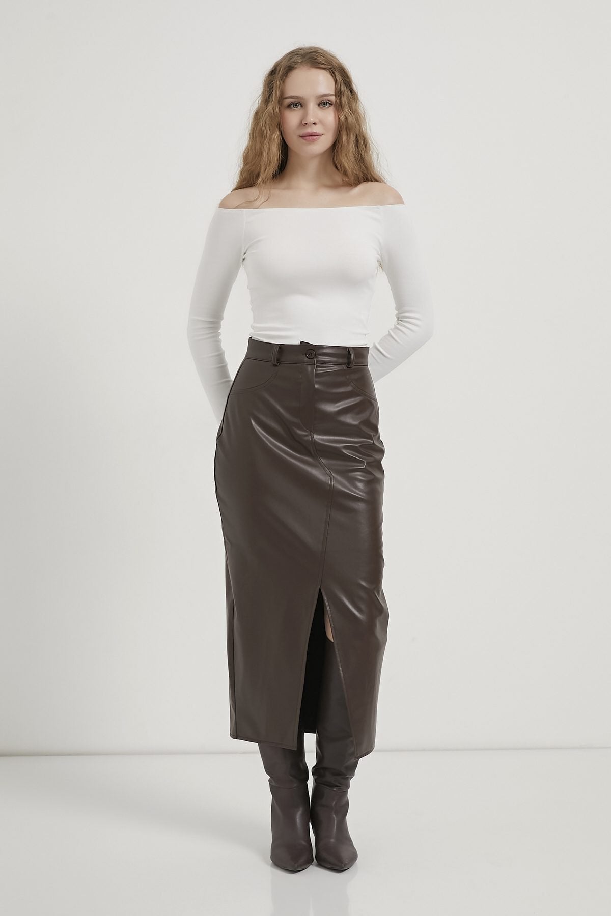 Faux leather women's skirt with front slit